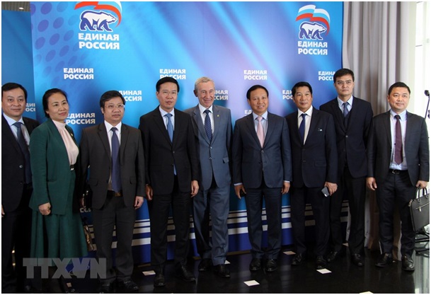 Trong ảnh: Đồng chí Võ Văn Thưởng chụp ảnh kỷ niệm với đại diện Đảng Nước Nga thống nhất. (Ảnh: Hồng Quân/TTXVN)