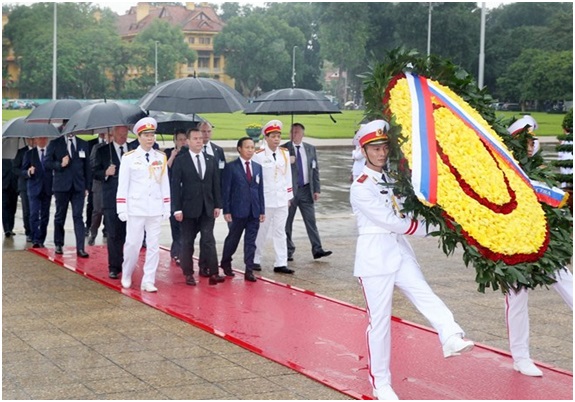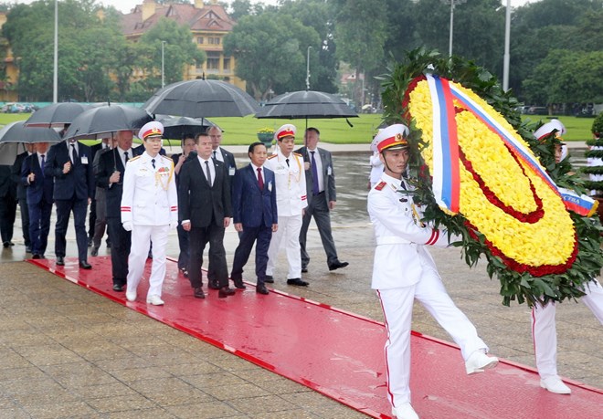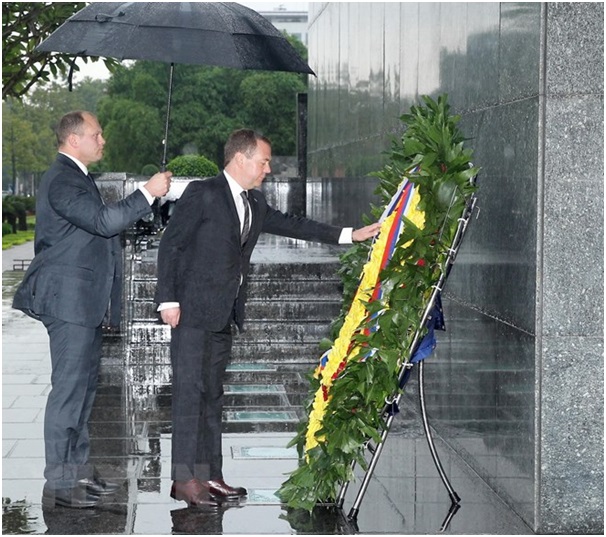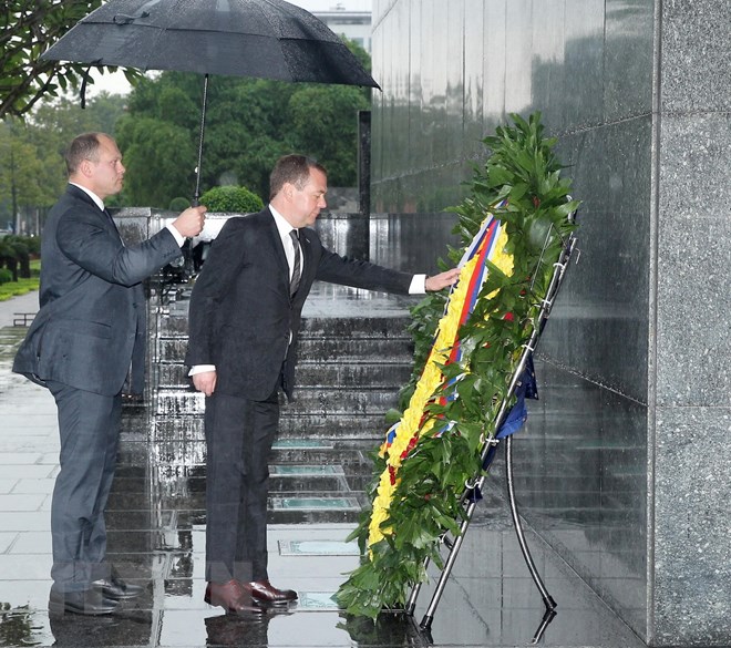 Thủ tướng Liên bang Nga Dmitry Medvedev đến đặt vòng hoa và vào Lăng viếng Chủ tịch Hồ Chí Minh. (Ảnh: Lâm Khánh/TTXVN)