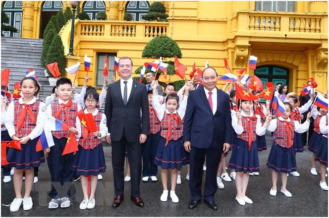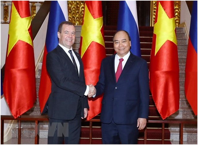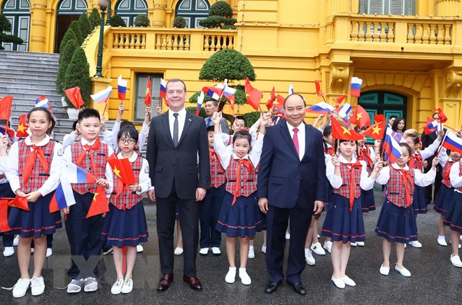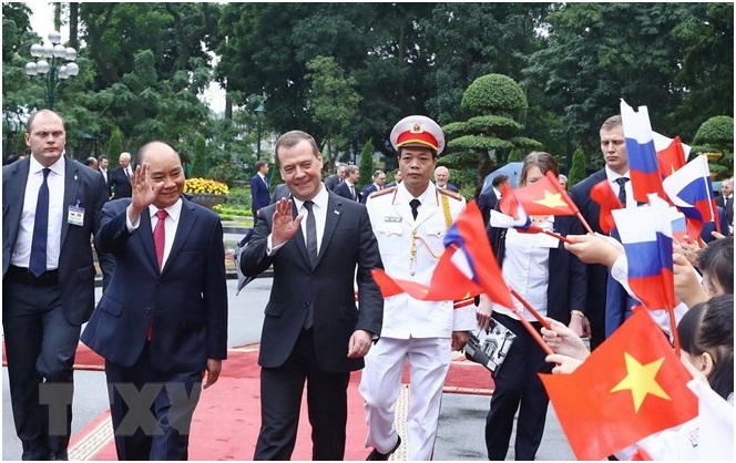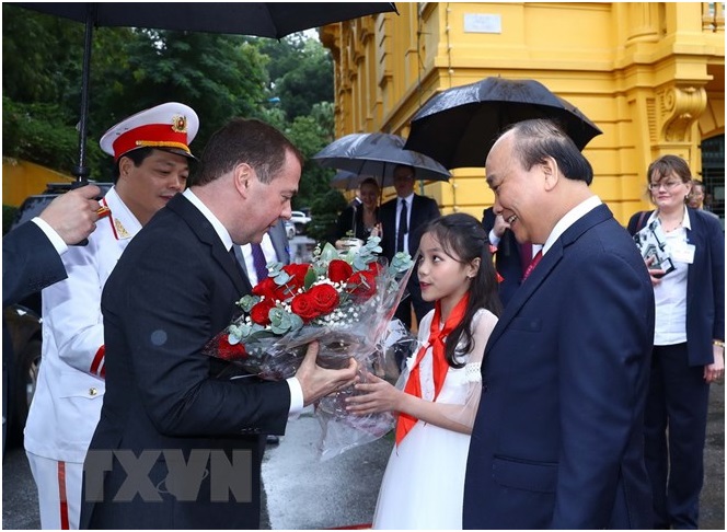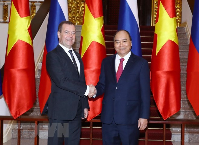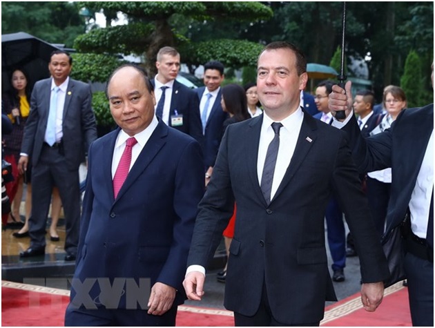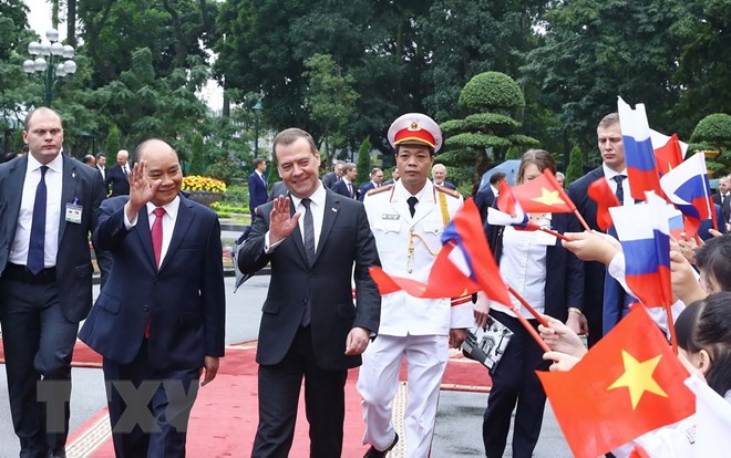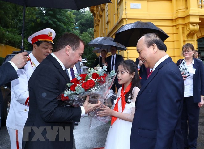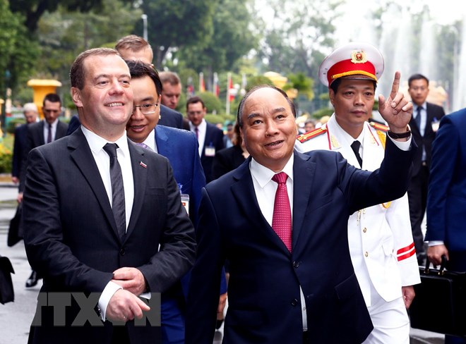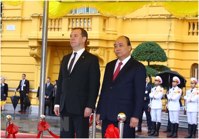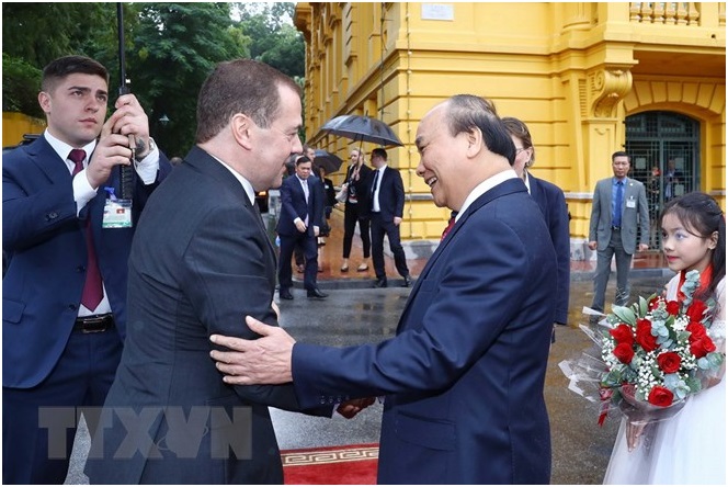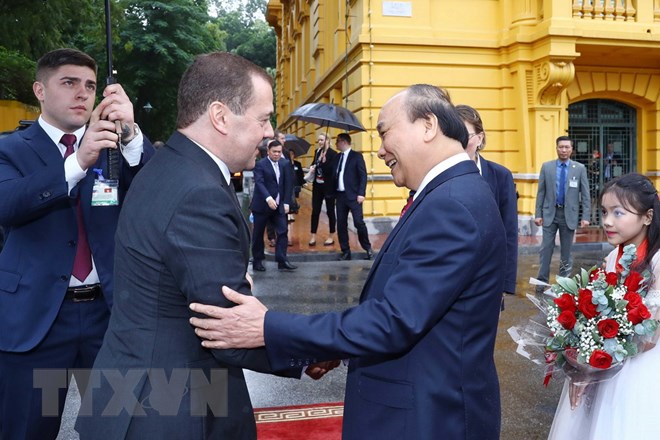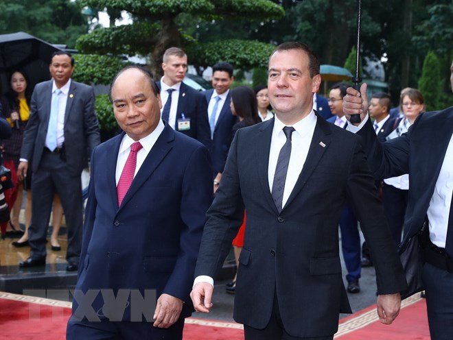 Thủ tướng Nguyễn Xuân Phúc đón Thủ tướng Liên bang Nga Dmitry Medvedev. (Ảnh: Thống Nhất/TTXVN)