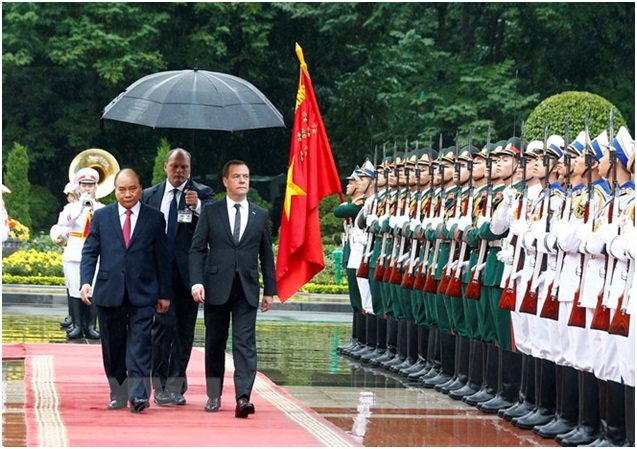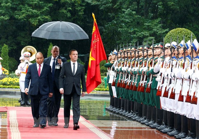 Thủ tướng Nguyễn Xuân Phúc và Thủ tướng Liên bang Nga Dmitry Medvedev duyệt Đội danh dự Quân đội nhân Việt Nam. (Ảnh: Thống Nhất/TTXVN)