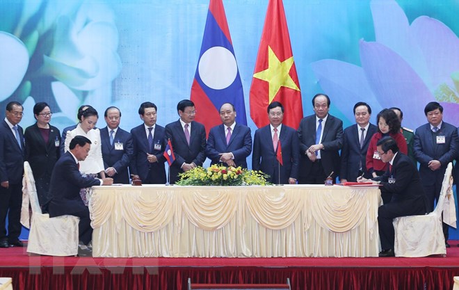 Thủ tướng Nguyễn Xuân Phúc và Thủ tướng Lào Thoongloun Sisoulith chứng kiến Lễ ký các văn bản hợp tác Việt Nam-Lào. (Ảnh: Lâm Khánh/TTXVN)