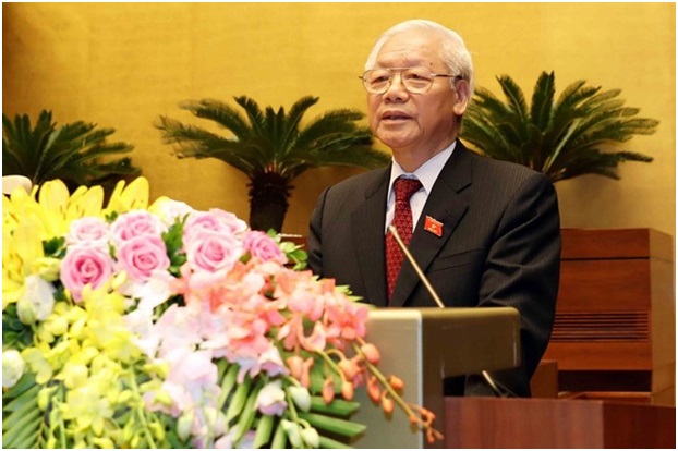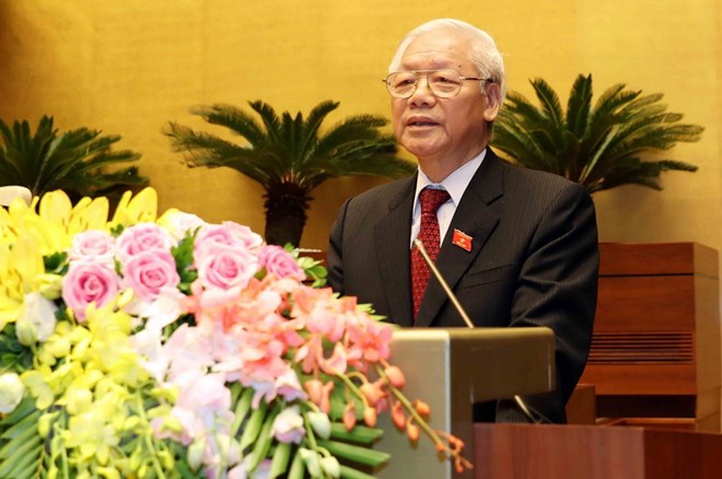Tổng Bí thư Nguyễn Phú Trọng, Chủ tịch nước nhiệm kỳ 2016-2021 phát biểu nhậm chức Chủ tịch nước. (Ảnh: Trí Dũng/TTXVN)