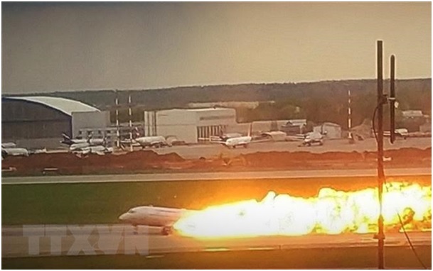 Máy bay chở khách bốc cháy dữ dội khi hạ cánh xuống sân bay Sheremetyevo ở Khimki, Nga. (Ảnh: AFP/TTXVN)