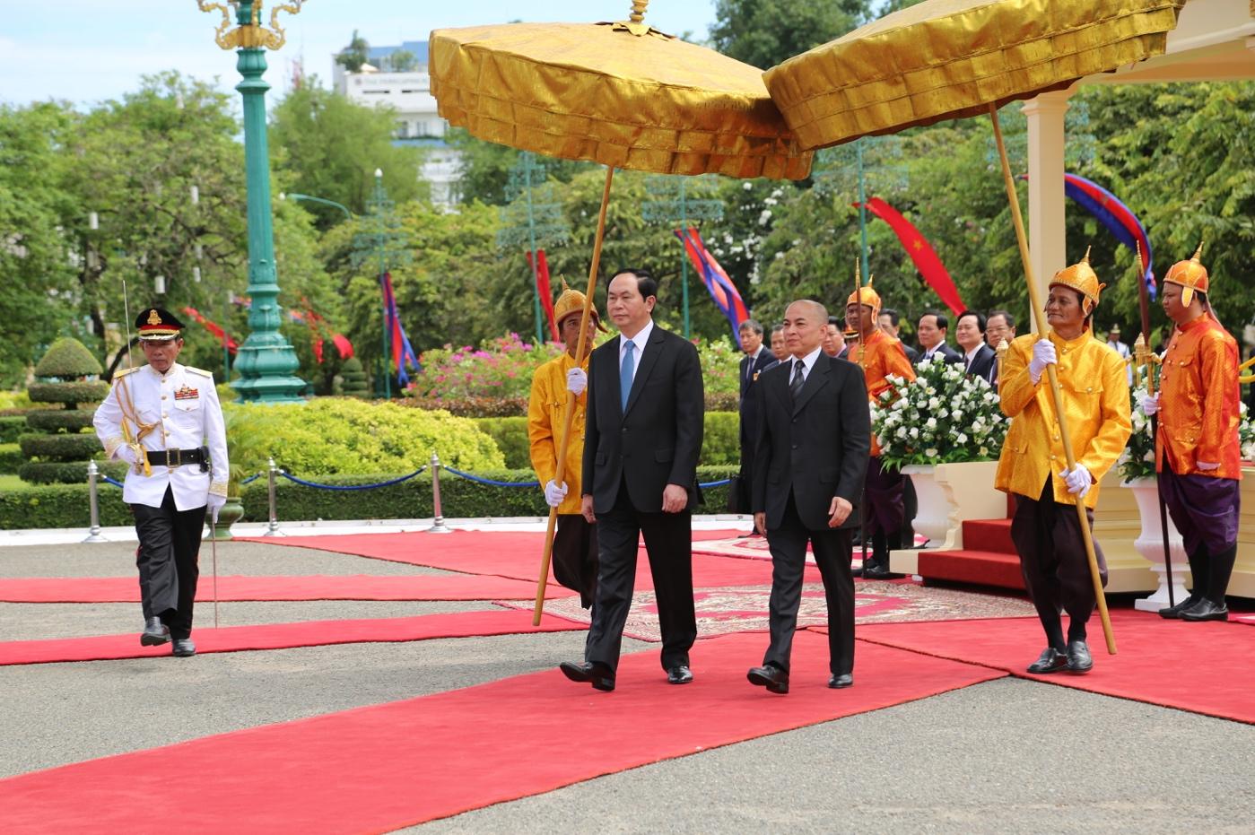 Tại thủ đô Phnôm Pênh của Campuchia, Chủ tịch nước Trần Đại Quang đã hội kiến Quốc vương Nô-rô-đôm Xi-ha-mô-ni; gặp Chủ tịch Thượng viện Xay Chum, Chủ tịch Quốc hội Hêng Xom Rin, Thủ tướng Hun Xen, thăm hai Đại Tăng thống Tếp Vông và Bu Kry; đặt vòng hoa tại Đài Độc lập, Đài tưởng niệm cố Quốc vương Nô-rô-đôm Xi-ha-núc và Đài kỷ niệm hữu nghị Việt Nam-Campuchia; gặp gỡ, nói chuyện với cán bộ nhân viên Đại sứ quán và bà con Việt kiều và gặp cộng đồng doanh nghiệp Việt Nam tại Campuchia; thăm Đại sứ quán ta tại Campuchia.