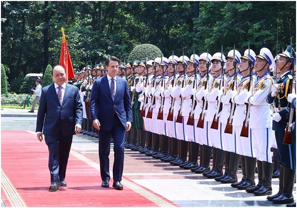 Sáng cùng ngày, tại Phủ Chủ tịch, Thủ tướng Chính phủ Nguyễn Xuân Phúc đã chủ trì Lễ đón chính thức Thủ tướng Giuseppe Conte.
