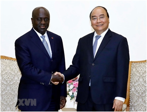 Thủ tướng Nguyễn Xuân Phúc tiếp Bộ trưởng Ngoại giao nước Cộng hòa Côte d'Ivoire Marcel Amon Tanoh đang có chuyến thăm chính thức Việt Nam. (Ảnh: Thống Nhất/TTXVN)
