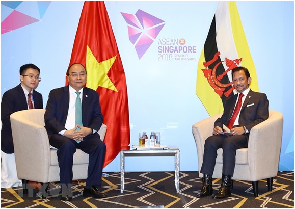 Thủ tướng Nguyễn Xuân Phúc gặp Quốc vương Brunei Hassanal Bolkiah, trong chương trình tham dự Hội nghị Cấp cao ASEAN lần thứ 33 và các hội nghị cấp cao liên quan. (Ảnh: Thống Nhất/TTXVN)