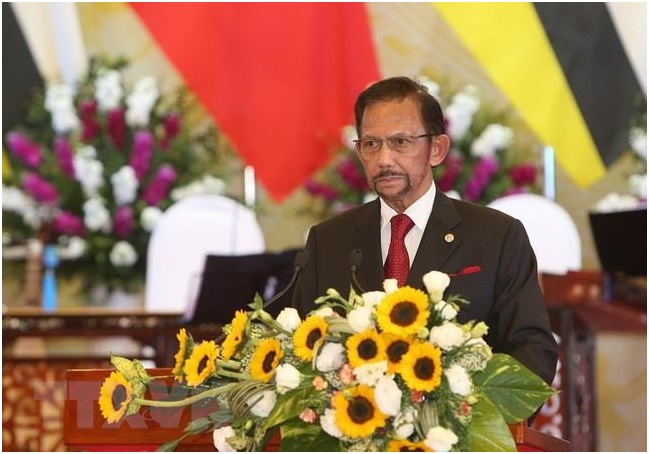 Quốc vương Brunei Hassanal Bolkiah phát biểu tại buổi chiêu đãi. (Ảnh: Dương Giang/TTXVN)