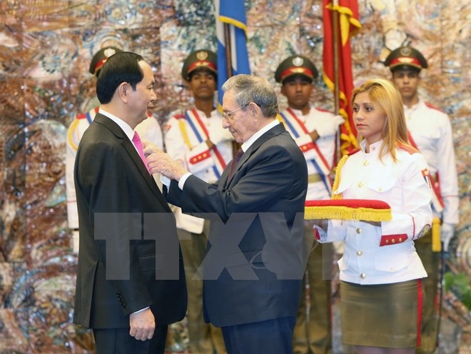 Chủ tịch Raul Castro trao Huân chương Jose Marti cho Chủ tịch nước Trần Đại Quang. (Ảnh: Nhan Sáng/TTXVN)