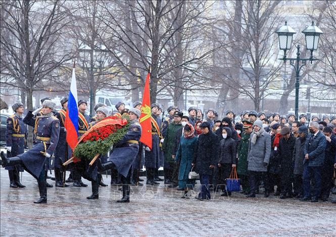 Chủ tịch nước Nguyễn Xuân Phúc và Phu nhân cùng Đoàn đại biểu cấp cao Việt Nam đặt vòng hoa tại Đài tưởng niệm các liệt sỹ vô danh tại Thủ đô Moskva. Ảnh: Thống Nhất/TTXVN.