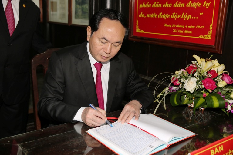 Chủ tịch nước Trần Đại Quang viết vào sổ lưu niệm - ảnh Tấn Đức