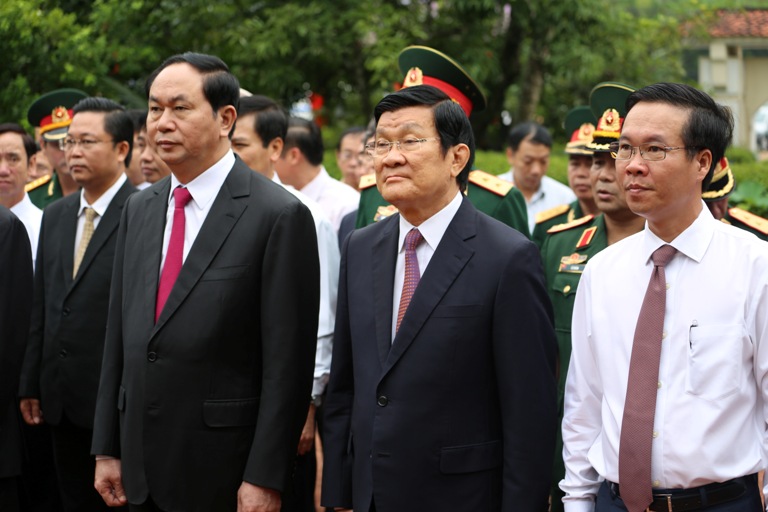 Chủ tịch nước Trần Đại Quang, nguyên Chủ tịch nước Trương Tấn Sang, đồng chí Võ Văn Thưởng, Ủy viên Bộ Chính trị, Bí thư Trung ương Đảng, Trưởng Ban Tuyên giáo Trung ương cùng các đại biểu dành một phút mặc niệm tưởng nhớ Quyền Chủ tịch nước Huỳnh Thúc Kháng - ảnh Tấn Đức