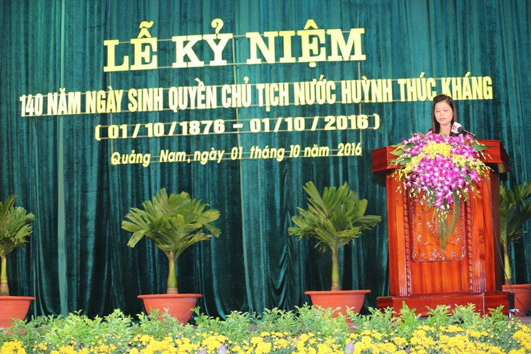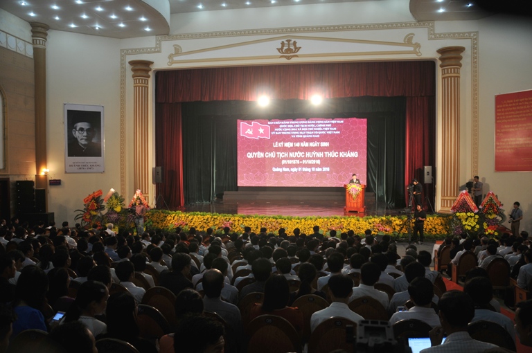 Lúc 9h ngày 1-10 tại Trung tâm văn hóa tỉnh Quảng Nam diễn ra “Lễ kỷ niệm 140 năm ngày sinh của chí sĩ yêu nước Huỳnh Thúc Kháng, nguyên quyền Chủ tịch nước Việt Nam Dân chủ cộng hòa (1-10-1876 - 1-10-2016). Chủ tịch nước Trần Đại Quang, nguyên Chủ tịch nước Trương Tấn Sang cùng đông đảo đại diện lãnh đạo các đồng chí lãnh đạo các Ban, bộ, ngành Trung ương, cùng lãnh đạo một số địa phương đã tham dự lễ kỷ niệm.