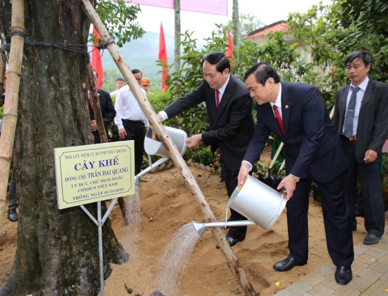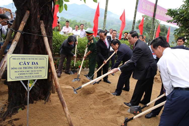 Chủ tịch nước Trần Đại Quang trồng cây lưu niệm tại Nhà lưu niệm cụ Huỳnh Thúc Kháng (xã Tiên Cảnh, Tiên Phước) - ảnh Tấn Đức