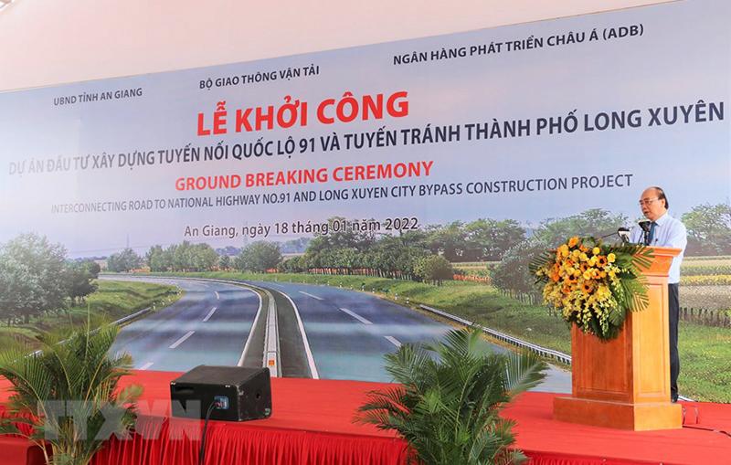 Chủ tịch nước Nguyễn Xuân Phúc phát biểu tại lễ khởi công dự án xây dựng tuyến nối Quốc lộ 91 và tuyến tránh thành phố Long Xuyên. (Ảnh: Công Mạo/TTXVN)