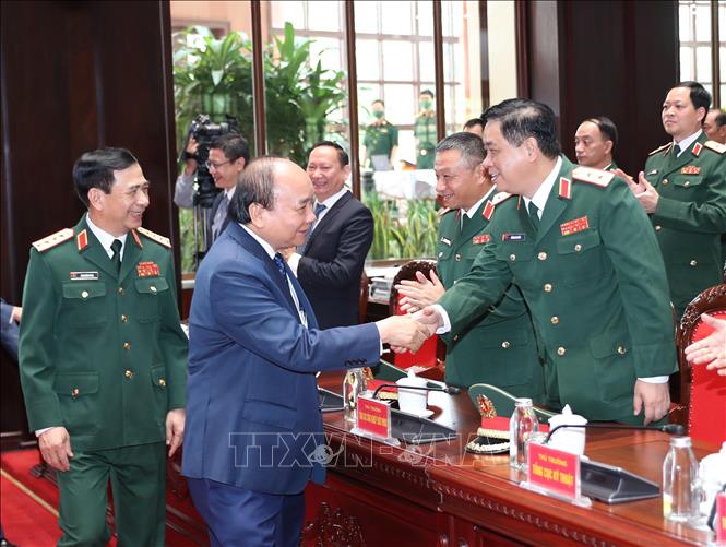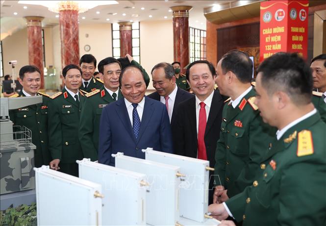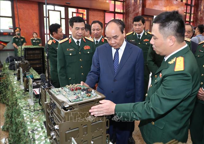 Chủ tịch nước Nguyễn Xuân Phúc tham quan trưng bày sản phẩm khoa học, công nghệ lĩnh vực quân sự, quốc phòng.