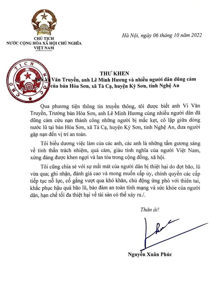 Ngày 6/10, Chủ tịch nước Nguyễn Xuân Phúc đã gửi Thư khen anh Vi Văn Truyền, Trưởng bản Hòa Sơn, anh Lê Minh Hương cùng nhiều người dân đã dũng cảm cứu nạn thành công những người bị mắc kẹt, cô lập giữa dòng nước lũ tại bản Hòa Sơn, xã Tà Cạ, huyện Kỳ Sơn, tỉnh Nghệ An. Văn phòng Chủ tịch nước trân trọng giới thiệu Thư của Chủ tịch nước: