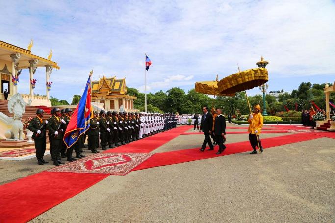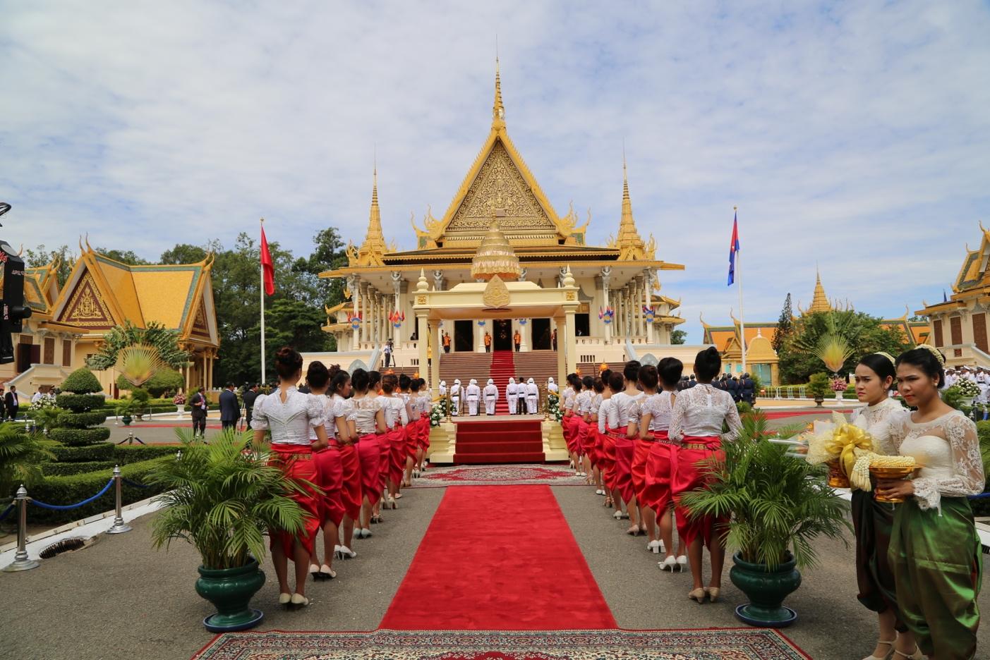 Đúng 10h đoàn xe của Chủ tịch nước có mặt tại Hoàng Cung. Quốc vương Nô-rô-đôm Xi-ha-mô-ni nhiệt liệt chào mừng Chủ tịch nước Trần Đại Quang và Đoàn đại biểu cấp cao Nhà nước Việt Nam sang thăm cấp Nhà nước Vương quốc Cam-pu-chia, coi đây là dấu mốc quan trọng đưa quan hệ hữu nghị và hợp tác trên tất cả các lĩnh vực giữa hai nước phát triển ngày càng đi vào chiều sâu, ổn định và bền vững. Quốc vương Nô-rô-đôm Xi-ha-mô-ni mời chủ tịch nước Trần Đại Quang bước lên bục danh dự, Quốc thiều hai nước được cử hành, hòa trong tiếng nhạc trầm hùng, Quốc vương Xi-ha-mô-ni mời Chủ tịch nước Trần Đại Quang duyệt đội danh dự quân đội Hoàng gia Campuchia.