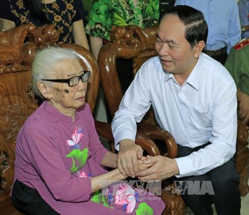 Chủ tịch nước Trần Đại Quang đến thăm và tặng quà Mẹ Việt Nam Anh hùng Phạm Thị Vọt, 98 tuổi, ở ngõ An Lạc 3, phường Sở Dầu, quận Hồng Bàng, thành phố Hải Phòng ngày 23/6. Ảnh: Nhan Sáng/TTXVN