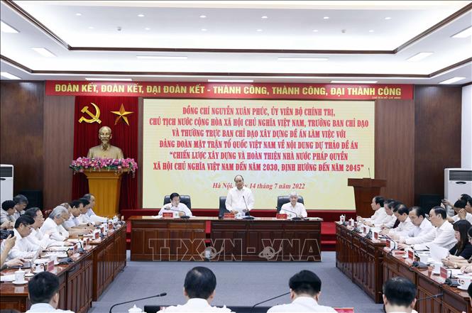 Sáng 14/7/2022, tại Hà Nội, Chủ tịch nước Nguyễn Xuân Phúc, Trưởng Ban chỉ đạo xây dựng Đề án làm việc với Đảng đoàn Mặt trận Tổ quốc Việt Nam về nội dung dự thảo đề án "Chiến lược xây dựng và hoàn thiện Nhà nước pháp quyền xã hội chủ nghĩa Việt Nam đến năm 2030, định hướng đến năm 2045”.