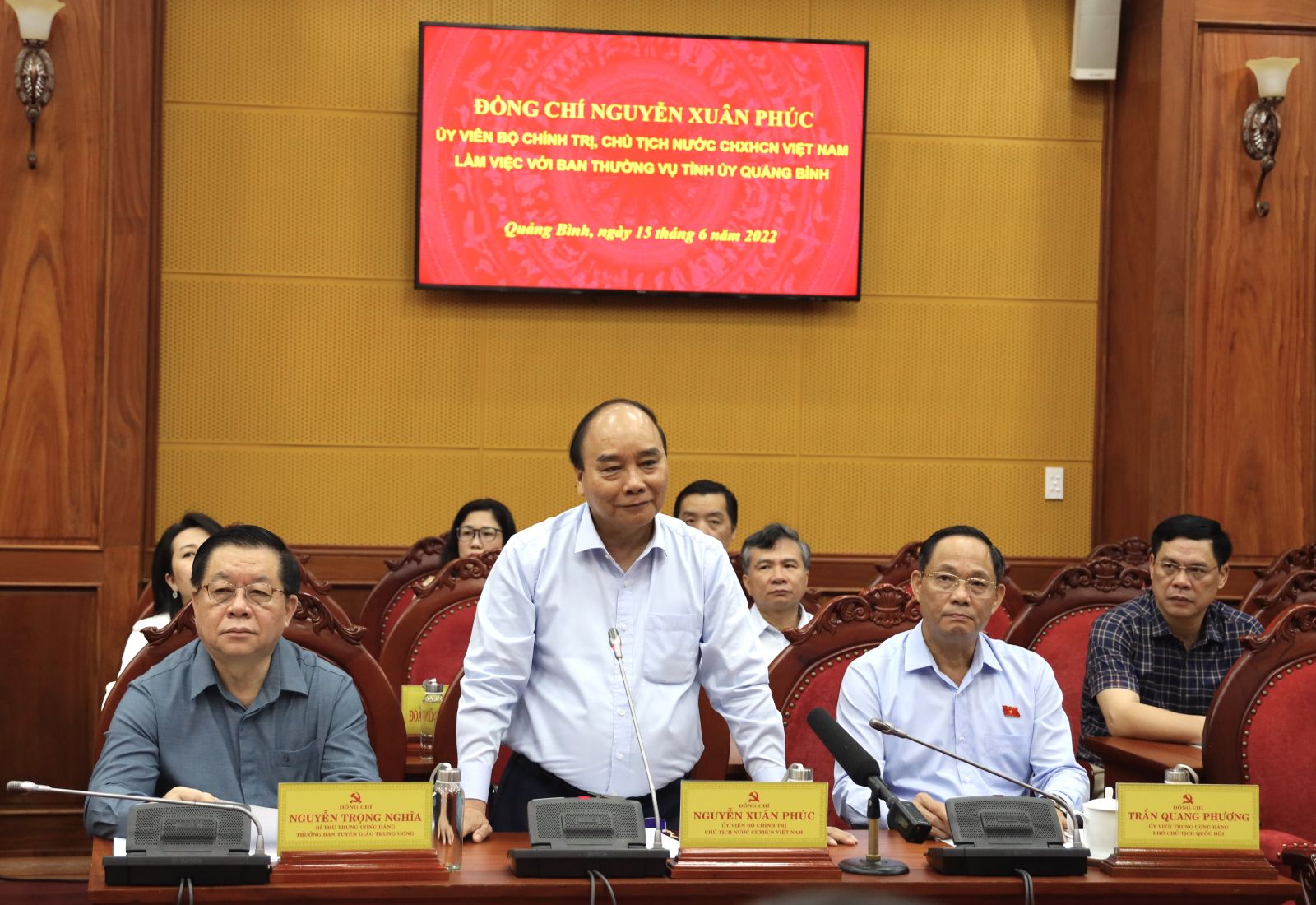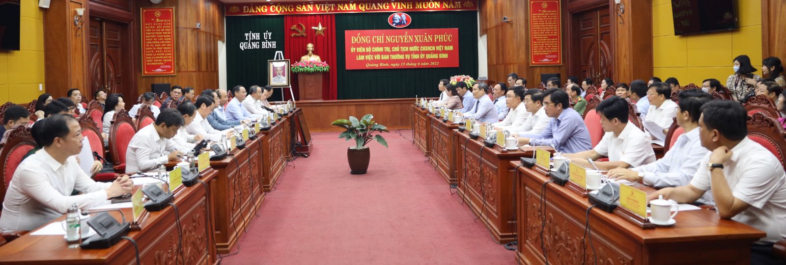Nhấn mạnh Đảng và Nhà nước đặt nhiều kỳ vọng vào Quảng Bình, Chủ tịch nước đề nghị Ban Thường vụ Tỉnh ủy chỉ đạo toàn diện, trong đó tập trung bám sát tiềm năng, thế mạnh nổi trội nhất và có tầm nhìn chiến lược trong phát triển. Tỉnh cần phát huy lợi thế của các mối liên kết vùng, tập trung nguồn lực cho phát triển kinh tế dựa trên bốn ngành trụ cột, gồm du lịch, nông nghiệp thông minh, công nghiệp và phát triển bền vững kinh tế biển. Cần đặt mục tiêu rõ ràng, chọn lọc và xác định rõ các mũi nhọn kinh tế, làm nổi bật sự khác biệt định vị được vai trò của Quảng Bình trong chuỗi giá trị vùng, quốc gia.