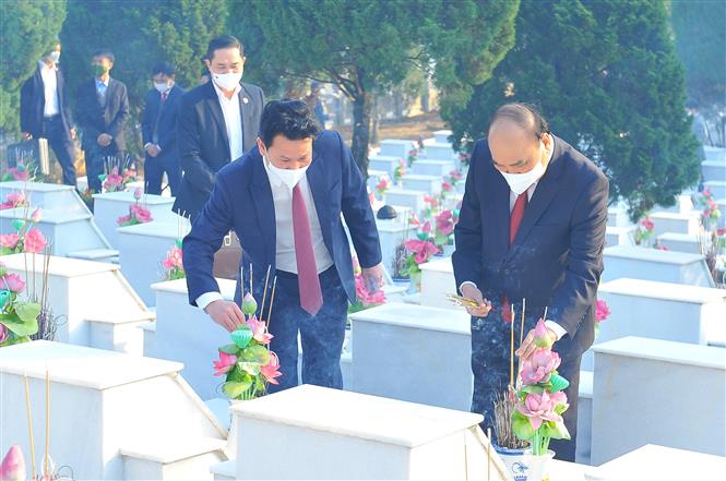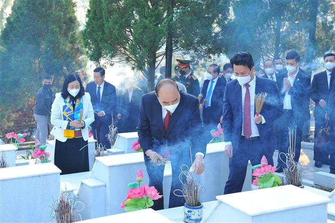 Trong chuyến công tác dự Lễ kỷ niệm 130 năm thành lập tỉnh Hà Giang (20/8/1891 - 20/8/2021), sáng 8/12/2021, Chủ tịch nước Nguyễn Xuân Phúc cùng đoàn công tác dâng hương tưởng niệm các Anh hùng liệt sĩ tại Nghĩa trang Liệt sĩ Quốc gia Vị Xuyên.