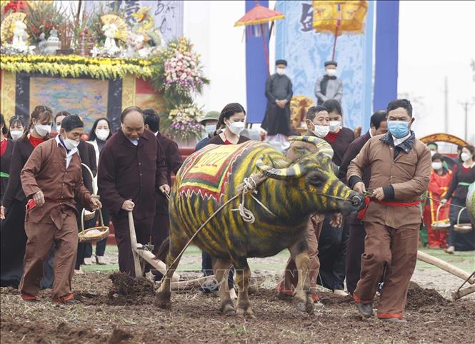 Trong trang phục nhà nông, Chủ tịch nước Nguyễn Xuân Phúc đã cùng các đại biểu và người dân địa phương thực hiện nghi thức tịch điền, cày những luống đất đầu tiên, khởi đầu cho mùa vụ mới bội thu.