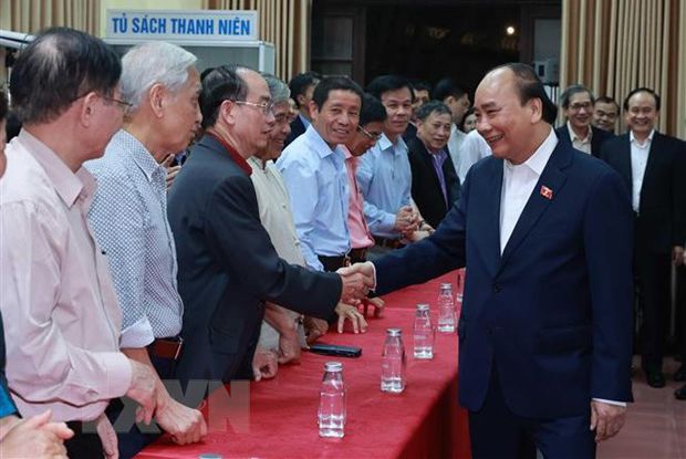 Chủ tịch nước Nguyễn Xuân Phúc với cử tri Tổ đân phố số 8, phường Điện Biên, quận Ba Đình, Hà Nội. (Ảnh: TTXVN)
