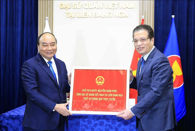 Chủ tịch nước Nguyễn Xuân Phúc tặng Đại sứ quán Việt Nam tại Liên bang Nga thiết bị phòng họp trực tuyến. Ảnh: Thống Nhất/TTXVN