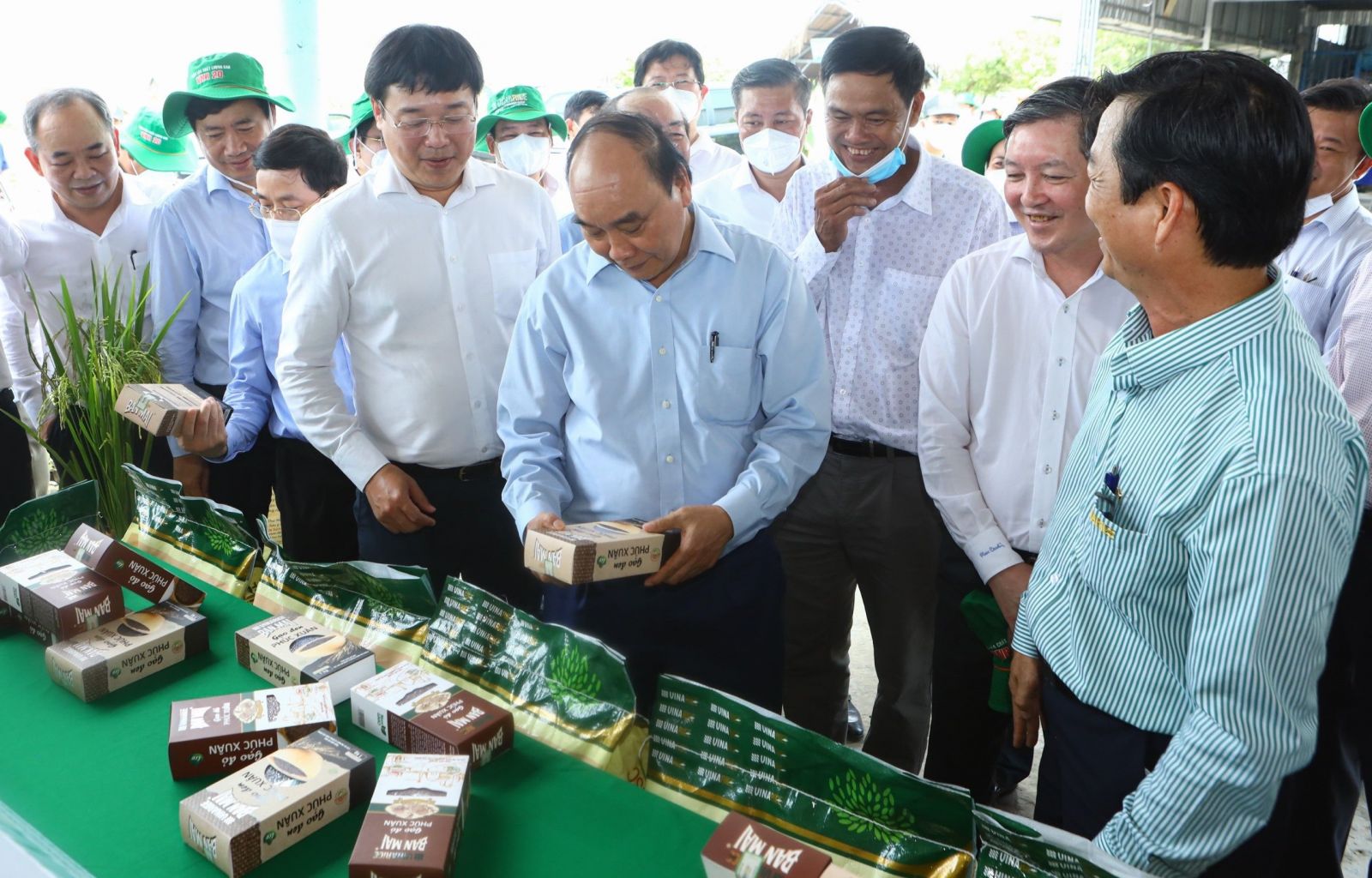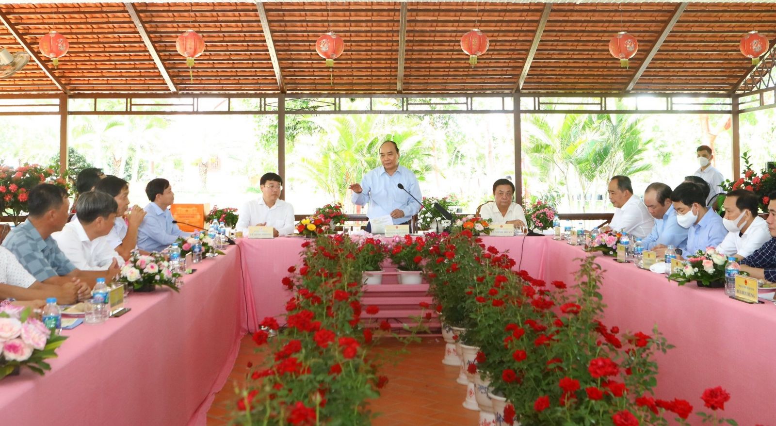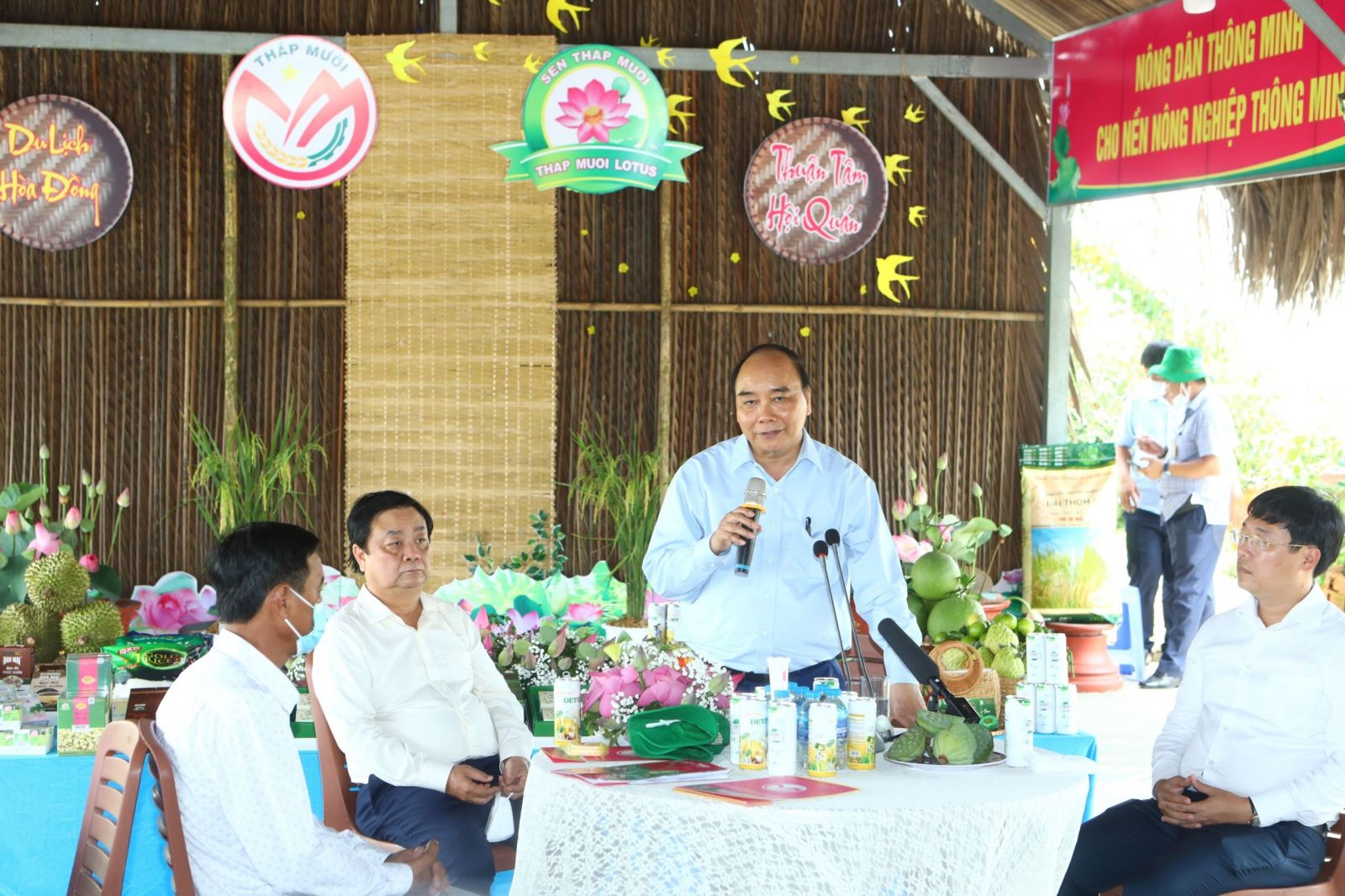 Chủ tịch nước phát biểu tại Hợp tác xã Dịch vụ Nông nghiệp Mỹ Đông 2, huyện Tháp Mười. Ảnh: VPCTN