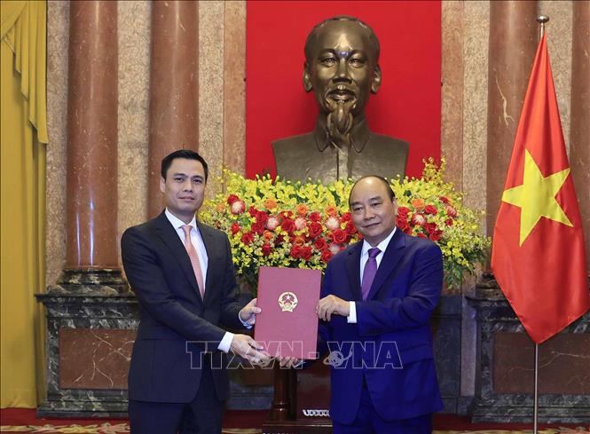 Chủ tịch nước Nguyễn Xuân Phúc trao Quyết định phong hàm Đại sứ bậc II cho Thứ trưởng Ngoại giao Phạm Quang Hiệu.