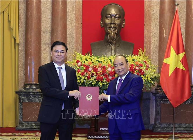 Chủ tịch nước Nguyễn Xuân Phúc trao Quyết định phong hàm Đại sứ bậc II cho Thứ trưởng Ngoại giao Phạm Quang Hiệu. (Ảnh: Thống Nhất/TTXVN)