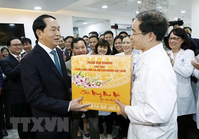 Chủ tịch nước Trần Đại Quang đã tới thăm hỏi, tặng quà Tết bệnh nhân nữ Trần Thị Hồng Tám (73 tuổi, Hà Nội) đang điều trị mổ u đại tràng; thăm các cháu nhỏ đang được điều trị tại Khu bệnh nhân Nhi nội trú.