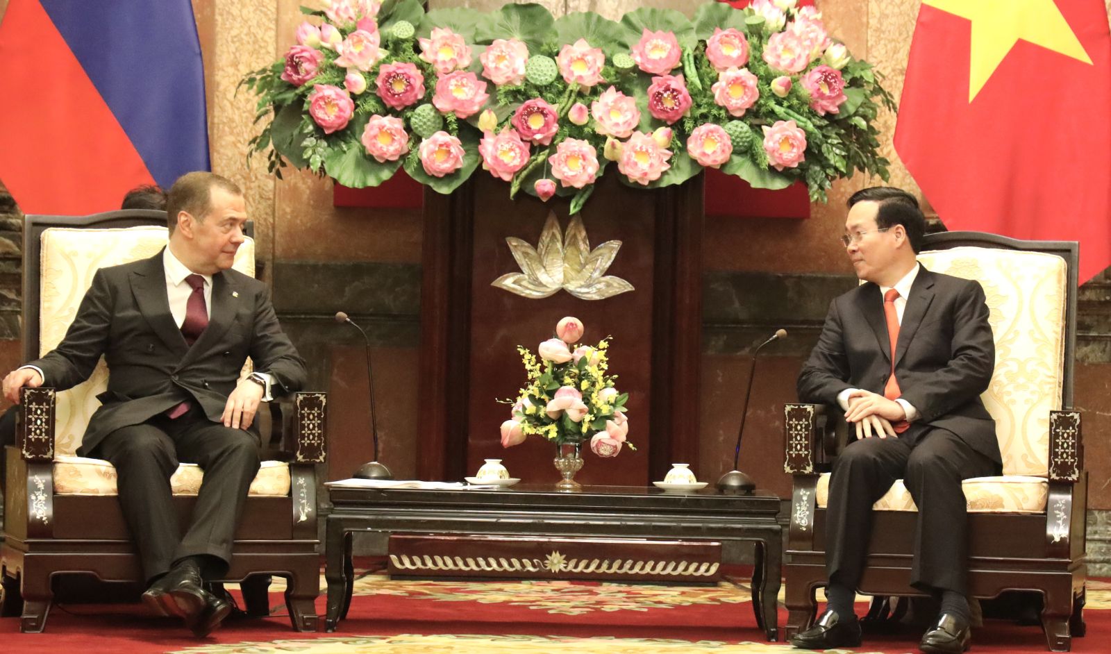 Chào mừng ông Dmitry Medvedev cùng Đoàn đại biểu cấp cao Liên bang Nga sang thăm Việt Nam, Chủ tịch nước Võ Văn Thưởng đánh giá cao ý nghĩa của chuyến thăm lần này là dịp để hai bên cùng trao đổi về những định hướng trong hợp tác Việt Nam – Nga nói chung, trong đó có hợp tác giữa hai Đảng, hai Nhà nước.