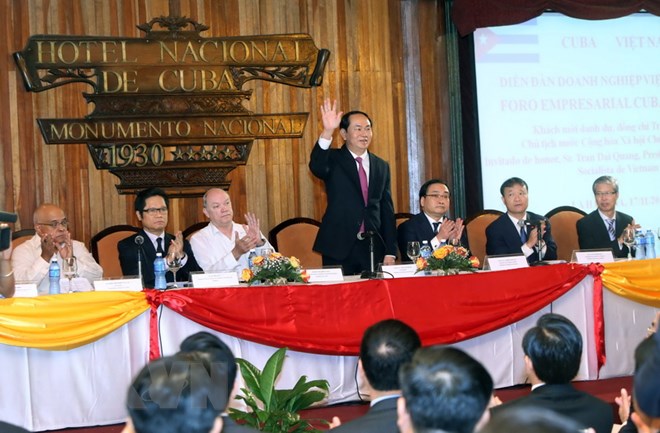 Tiếp tục các hoạt động trong chuyến thăm chính thức Cộng hòa Cuba, sáng 17/11 theo giờ Cuba (tối 17/11 theo giờ Hà Nội), Chủ tịch nước Trần Đại Quang và Đoàn đại biểu cấp cao Đảng, Nhà nước Việt Nam đã tới dự và phát biểu khai mạc Diễn đàn doanh nghiệp Việt Nam-Cuba, do Phòng Thương mại và Công nghiệp Việt Nam phối hợp với Đại sứ quán Việt Nam tại Cuba và Phòng Thương mại Cuba tổ chức tại khách sạn Nacional de Cuba ở thủ đô La Habana.