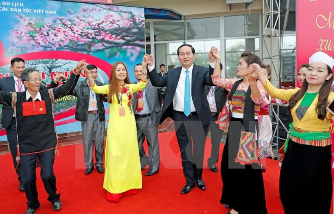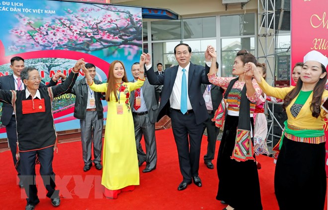 Thay mặt lãnh đạo Đảng, Nhà nước, Chủ tịch nước Trần Đại Quang tới dự, chúc Tết cộng đồng các dân tộc Việt Nam.