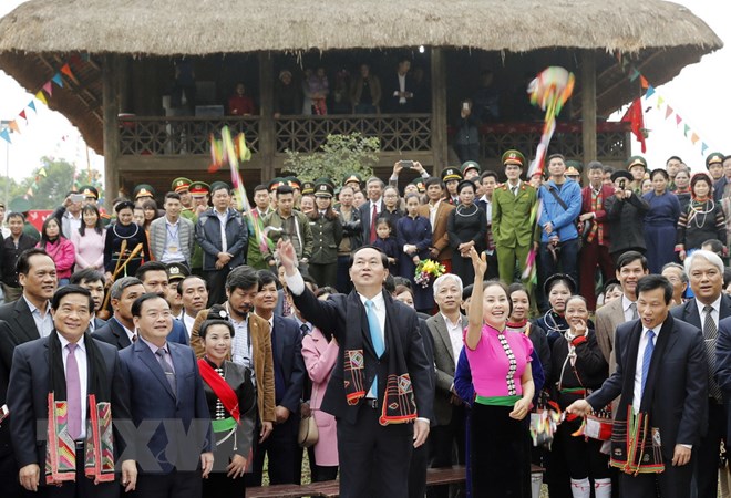 Chủ tịch nước Trần Đại Quang cùng bà con các dân tộc tham gia ném Còn tại làng dân tộc Thái tỉnh Điện Biên. (Ảnh: Nhan Sáng/TTXVN)