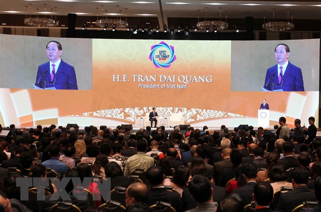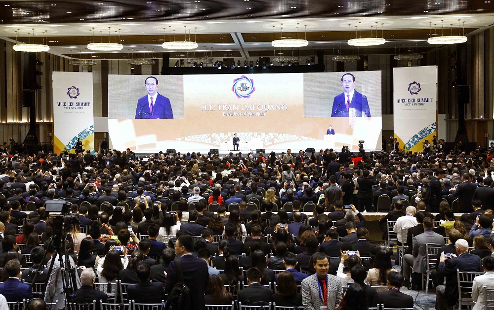 Chào mừng các doanh nghiệp tới tham dự CEO Summit 2017, Chủ tịch nước Trần Đại Quang nêu rõ cộng đồng doanh nghiệp châu Á-Thái Bình Dương có đóng góp rất to lớn trong những thành tựu của APEC.