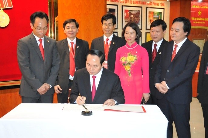 Chủ tịch nước Trần Đại Quang viết lưu bút tại phòng Truyền thống Trường ĐHBK HN - Ảnh: Mạnh Tiến