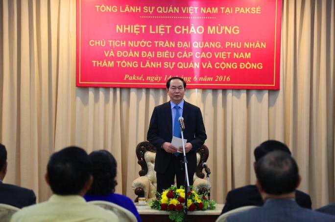 Nói chuyện với cán bộ, nhân viên Tổng Lãnh sự quán Việt Nam tại Pắc-xế và bà con Việt kiều đang sinh sống và làm ăn tại tỉnh Chăm-pa-xắc, Chủ tịch nước Trần Đại Quang thông báo một số thông tin về chuyến thăm cấp Nhà nước CHDCND Lào và tình hình phát triển kinh tế xã hội của đất nước với bà con kiều bào.