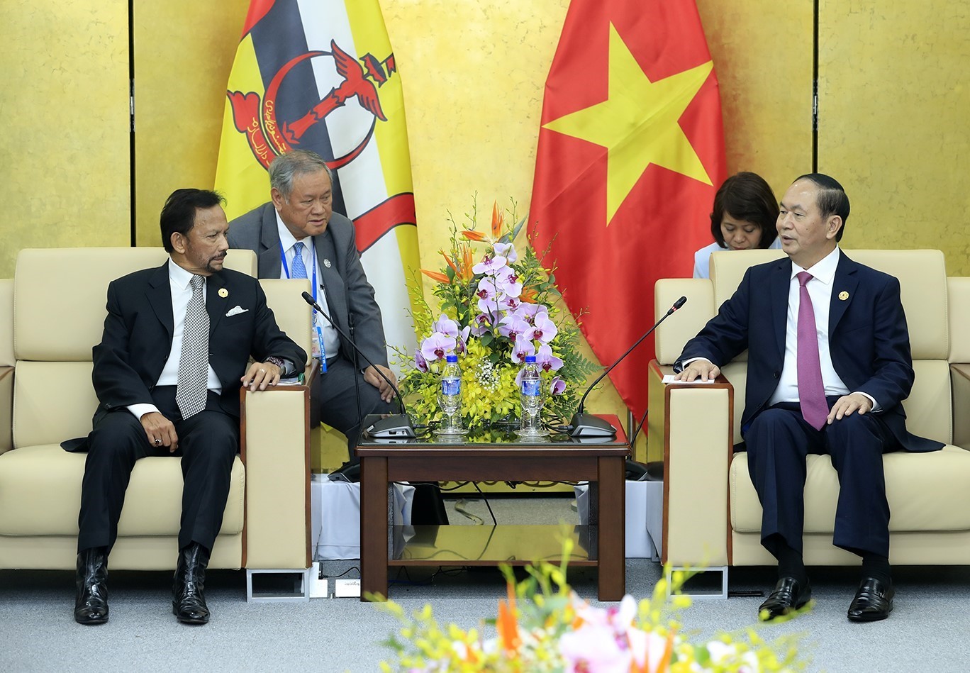 Chủ tịch nước Trần Đại Quang gặp song phương Quốc vương Brunei Sultan Hagi Hassanal Bolkiah. (Nguồn: TTXVN)