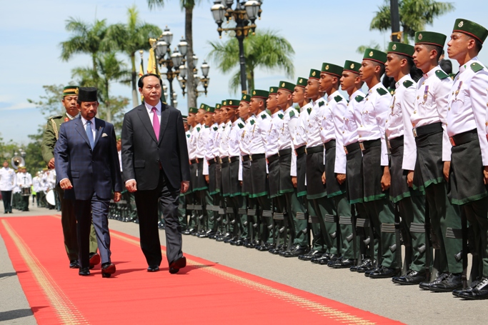 Chủ tịch nước Cộng hòa Xã hội Chủ nghĩa Việt Nam Trần Đại Quang và Quốc vương Bờ-ru-nây duyệt Đội danh dự - ảnh: Tấn Đức