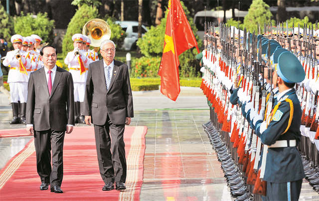 Chủ tịch nước Trần Đại Quang và Tổng thống Htin Kyaw duyệt đội danh dự Quân đội Nhân dân Việt Nam. Ảnh: Duy linh (Nhân dân)