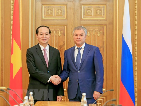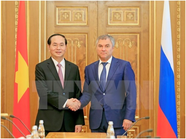 Chủ tịch nước Trần Đại Quang bày tỏ vui mừng trước sự phát triển tốt đẹp của quan hệ Đối tác chiến lược toàn diện giữa Việt Nam và Liên bang Nga trên các lĩnh vực; nhấn mạnh Việt Nam luôn quan tâm và đánh giá cao những thành tựu mà Liên bang Nga đạt được trong việc ổn định và phát triển kinh tế-xã hội, không ngừng nâng cao vị thế cường quốc của mình và cho rằng Duma Quốc gia Nga đã có nhiều đóng góp hết sức quan trọng vào những thành công này.