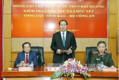 Nhân dịp Tết cổ truyền Đinh Dậu, chiều 25-1, tại Hà Nội, Chủ tịch nước Trần Đại Quang đã đến thăm, kiểm tra công tác sẵn sàng chiến đấu, chúc Tết cán bộ, chiến sĩ Tổng cục Tình báo (Bộ Công an).