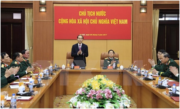 Chiều 6/9, tại Hà Nội, Chủ tịch nước Trần Đại Quang đã có buổi làm việc với lãnh đạo Bộ Quốc phòng, nghe báo cáo kết quả triển khai thực hiện nhiệm vụ quân sự, quốc phòng trong thời gian qua và chỉ đạo một số nội dung cần tập trung thực hiện trong thời gian tới.