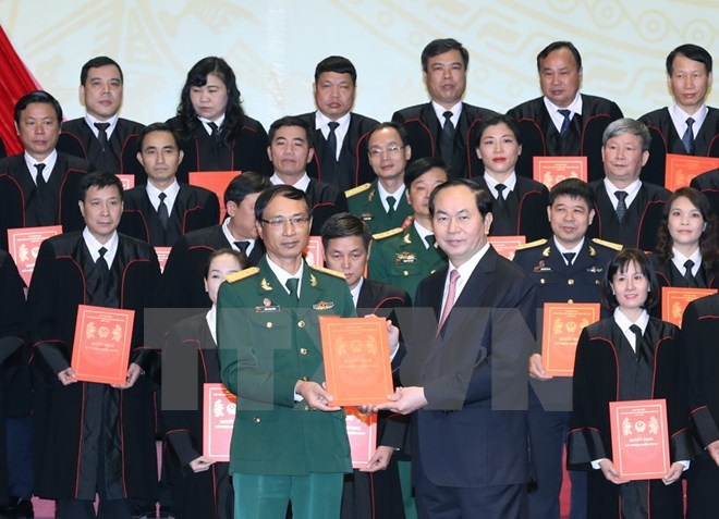 Chủ tịch nước Trần Đại Quang trao Quyết định bổ nhiệm 80 thẩm phán cao cấp. (Ảnh: Nhan Sáng/TTXVN)