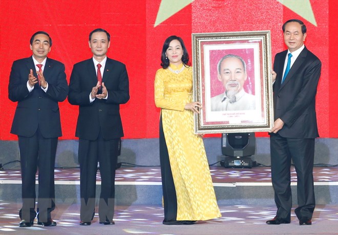Chủ tịch nước Trần Đại Quang trao tặng bức chân dung Chủ tịch Hồ Chí Minh cho Đảng bộ, chính quyền và nhân dân tỉnh Ninh Bình. (Ảnh: TTXVN)