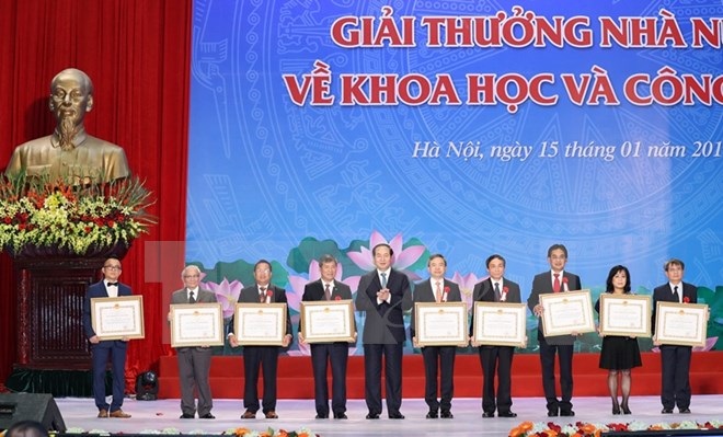 Chủ tịch nước Trần Đại Quang trao giải cho các tác giả đạt Giải thưởng Hồ Chí Minh về Khoa học và Công nghệ. (Ảnh: Nhan Sáng/TTXVN)