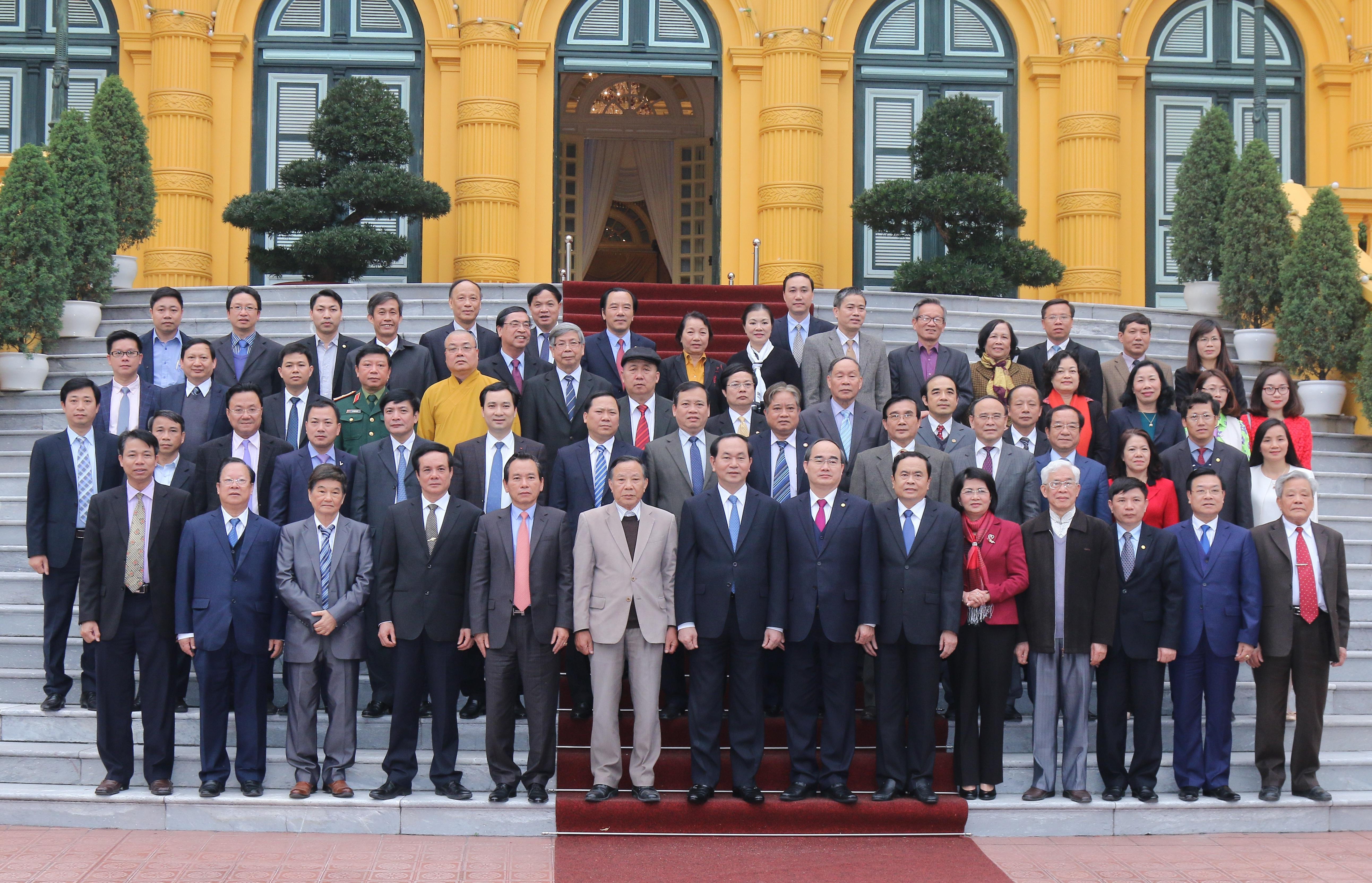 Chủ tịch nước Trần Đại Quang, Chủ tịch UBTW MTTQ Việt Nam Nguyễn Thiện Nhân, Phó Chủ tịch nước Đặng Thị Ngọc Thịnh, Phó Chủ tịch - Tổng thư ký UBTW MTTQ Việt Nam Trần Thanh Mẫn chụp ảnh lưu niệm với các đại biểu dự Hội nghị - Ảnh: VP